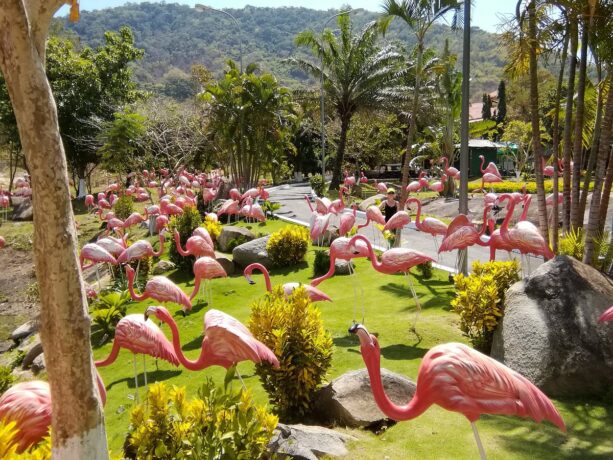 - китайский сад с дорожками, фонтанами и скульптурными фигурами розовых фламинго и знаков Зодиака.
