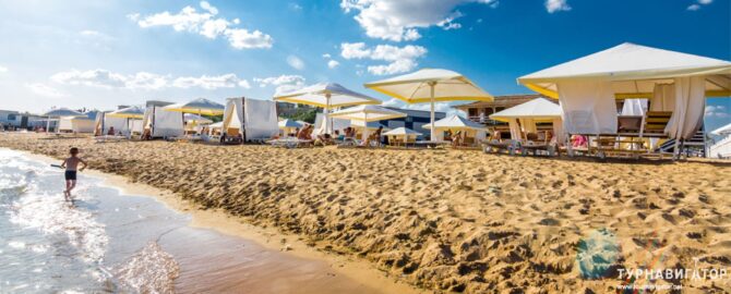 Оздоровительный комплекс Спутник предлагает вам еще один, средний по размерам и уровню удобства пляж. Здесь вы можете насладиться довольно широким берегом – под тридцать метров, а протяженность достигает трех с половиной сотен. Это гораздо меньше, чем у элитной Ривьеры, но и поток туристов тут редкий.