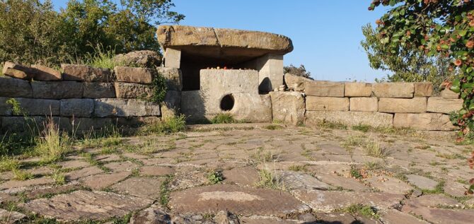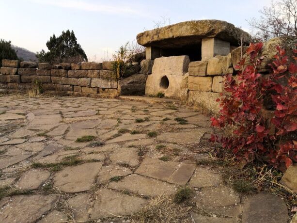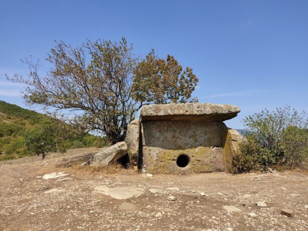 Если существует дольмен «Лунный», то обязательно должен быть в наличии дольмен «Солнечный». Противостояние двух светил было одной из вечных тем древней мифологии и религиозных языческих течений. Но свое название дольмен Солнечный получил в наше время из-за желтого цвета мегалитов, поросших мхом горчичного оттенка. Но, как утверждают местные жители, это всего лишь отговорки. До революции эта территория была огорожена высоким забором. Здесь находилось около 40 построек сакрального характера. Считалось, что, пробыв внутри дольмена некоторое время, камни заберут отрицательную энергию из тела человека, исцелят больные органы и продлят жизнь.