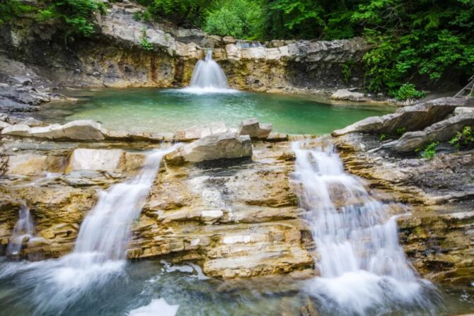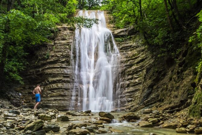 Для того, чтобы увидеть Гебиусские водопады, нужно отправиться в долину реки Тешебс. Она расположена недалеко от поселка Архипо-Осиповка. Комплекс состоит из 7 водопадов, три из которых являются самыми высокими. Они называются Шнурок, Пасть Дьявола и Грот. Остальные четыре водоската не менее живописны, но к ним редко водят туристические группы. Поэтому самостоятельное путешествие дает возможность досконально осмотреть всю территорию. Каскады протянулись на расстояние более километра вдоль русла реки. Их высота невелика (около 3 метров), в отличие от трех гигантов, сбрасывающих воду с 13, 15 и 17 метров.