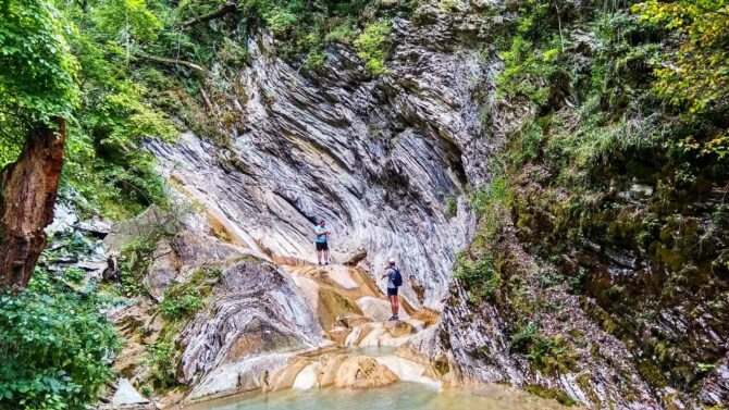 Оставив туристические группы, можно пройтись вверх по течению. Следующий водопад немного меньше по размерам, но не менее живописный. Территория вокруг него неблагоустроенная, но не сложная. Гораздо труднее будет пробираться через камни и кустарники к другим водоскатам. Это абсолютно дикая и очень интересная часть ущелья. Лучше всего приходить сюда весной, когда с гор стекает большое количество воды. местные предприниматели не собираются обустраивать другие водопады, так как летом они пересыхают и не представляют особого интереса. Дорогу от водопада в Левой мягкой щели вверх по течению реки Ачибс оценит только настоящий любитель природы.