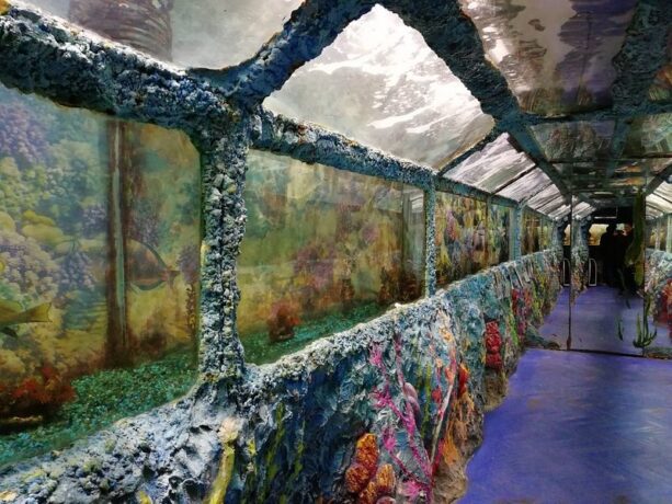 Океанариум представляет собой туннель, в котором аквариумы размещены вдоль стен, потолка и пола. У посетителей возникает ощущение, что их погрузили в морские пучины. Здесь можно увидеть обитателей соленых океанов, пресноводных рек и озер. Аквариумы разделены на 3 зоны согласно климатическим условиям. Организаторы выставки решили, что так реальнее сохранять требуемую температуру. В зале установлено трехмерное освещение. Оно позволяет более четко рассмотреть все плавающие и живущие в воде экспонаты. Аудио озвучка помогает создавать атмосферу подводного мира со всеми характерными для него звуками.