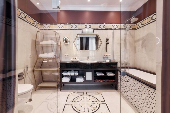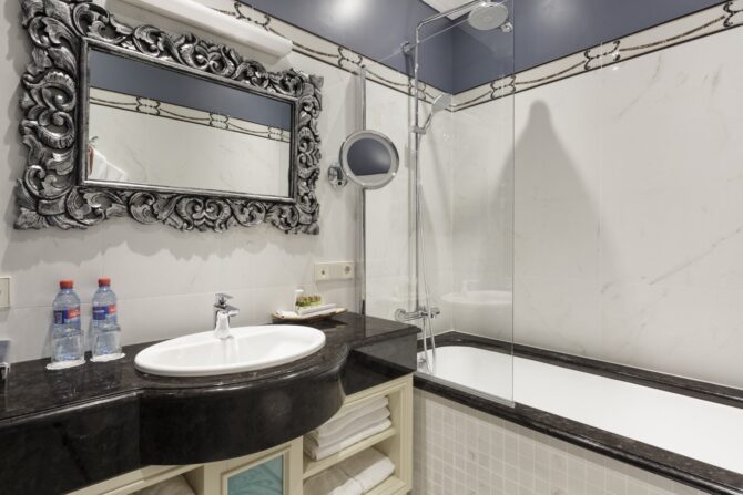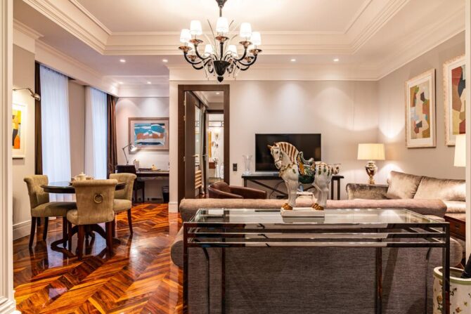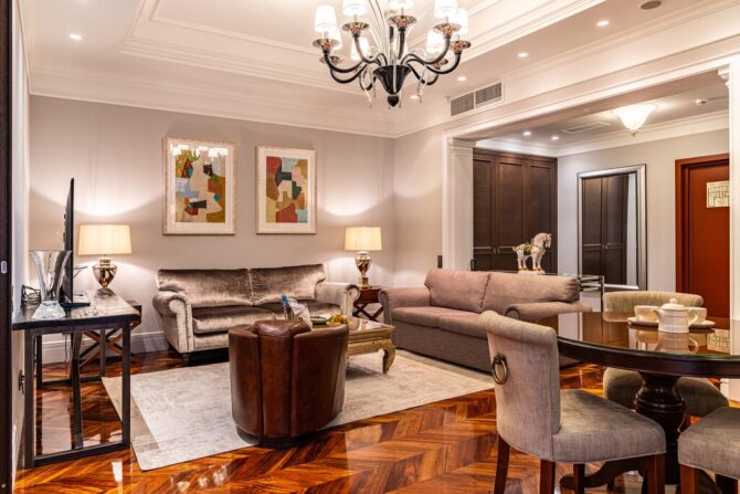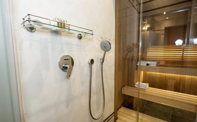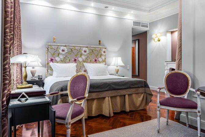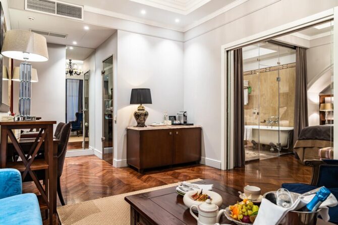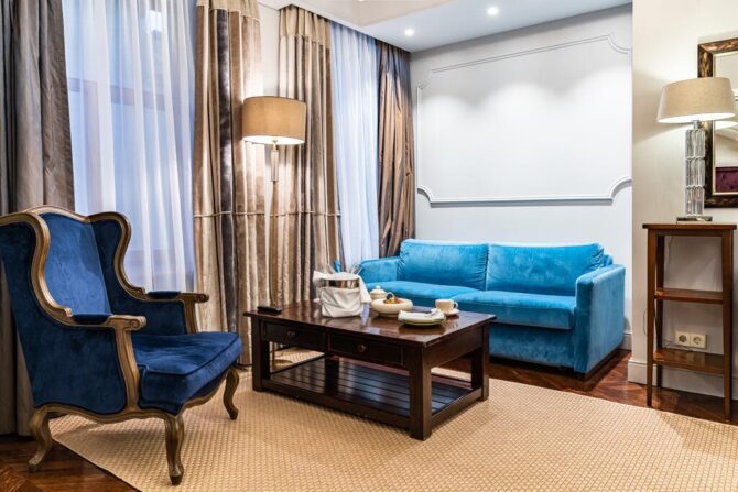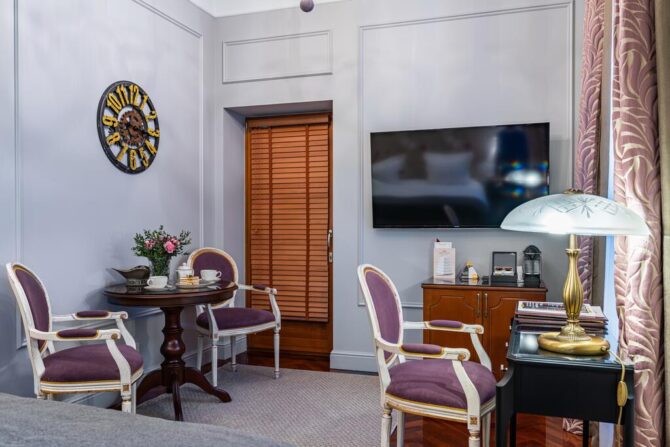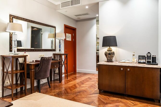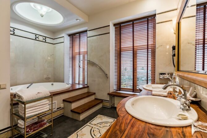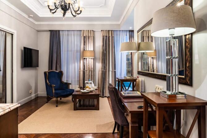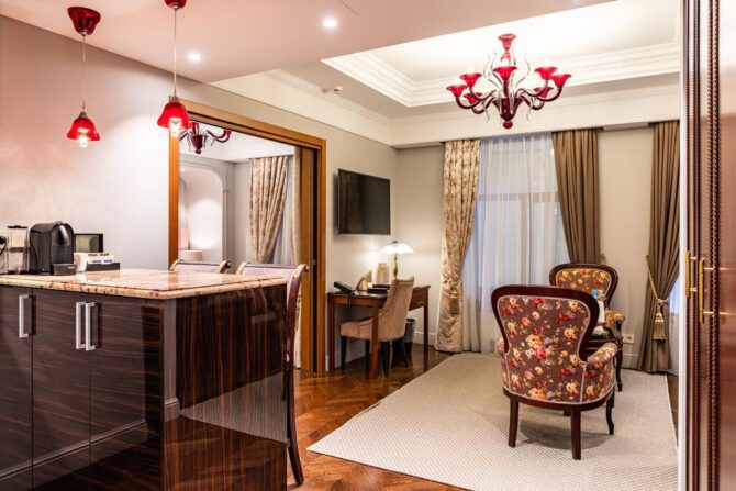 Представительский люкс – самый дорогой номер в отеле. Их два – первый площадью 70 м2, второй 90 м2. Вмещают трёх человек. Добавляется «зона SPA» – это небольшая сауна, круглая ванна-джакузи с гидромассажем. Пространства здесь имеют неповторимый интерьер с тщательно подобранными элементами декора.