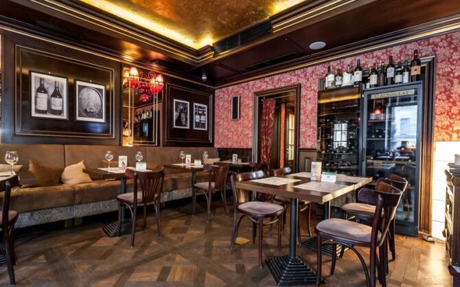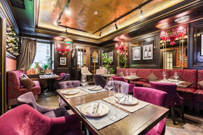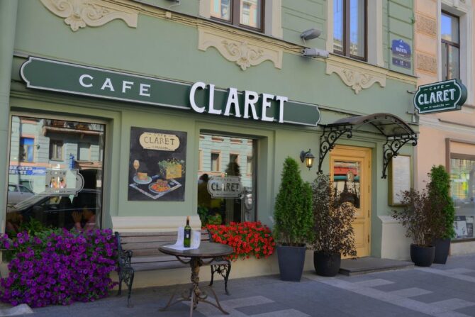 Кафе «CLARET» — это на самом деле полноценный ресторан высокой авторской кухни с маленькими порциями и солидными расценками. Претендует на молекулярную кухню: «форель, маринованная со свеклой и водкой», «пена из пармезана и трюфеля», «чипсы из сельдерея, эмульсия из яблок и шпината». Средний счёт по еде без напитков: 1500-2000р. Интерьер кафе необычно яркий, как будто попадаешь в сказку. Этому в немалой степени способствует мебель ярких красочных тонов. Алкоголь в заведении представлен в большом разнообразии и с ценами, в три раза превышающими магазинные. Поэтому любители выпить и сэкономить могут воспользоваться услугой «привези алкоголь с собой» или «купи в ближайшем магазине».