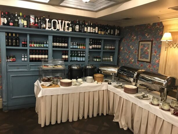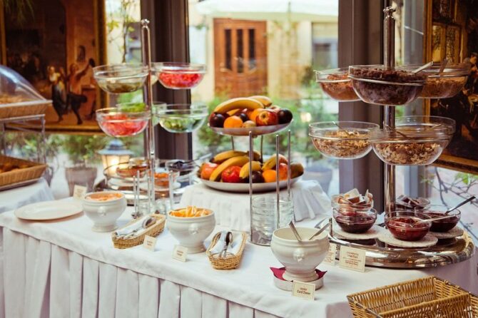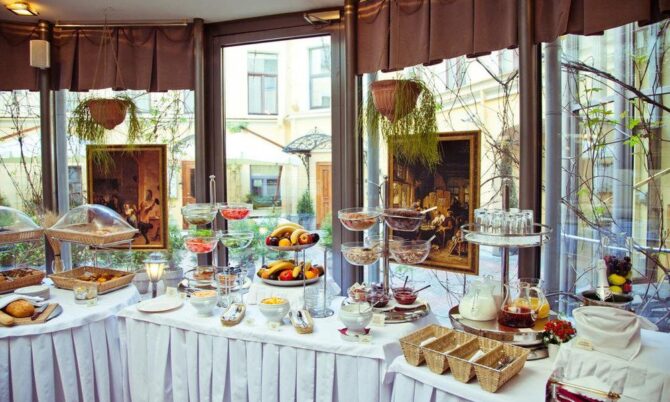 Завтрак подаётся в атриуме ресторана «Мариус» или кафе «Claret» в виде шведского стола. Выбор средний, блюда стандартные: омлеты, блинчики, сырники, овощи, фрукты, снэки. Есть и нарезки: сырная, мясная, рыбная. Молоко, йогурт, сметана. В общем, это был бы обычный шведский стол, если бы не чудесные десерты с выпечкой из ресторана. Маффины, пирожные, круассаны – всё отменного вкуса. С зерновым кофе заходит на ура. Ну и пожалуй, можно выделить аккуратную подачу, красивое оформление еды и приятное удобство того места, где проходят завтраки. Для настоящих аристократов разливают шампанское по бокалам, что встречается в основном в курортной зоне.
