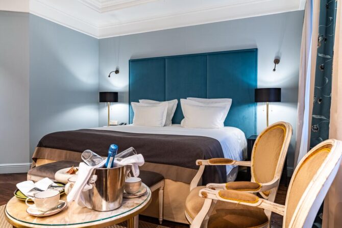 Делюкс занимает 28 м2 площади и вмещает двух человек. Здесь добавляется кофейный столик со стульями, а в некоторых номерах и отдельный диван. Совмещённый санузел раза в два больше по площади, чем в классическом варианте. В отделке используется лепнина, природный камень, дорогие ткани.