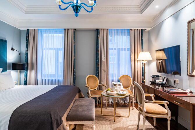 Earle F. пишет отзыв: «хороший отель, расположенный довольно близко к Эрмитажу и достопримечательностям. Дружелюбный персонал и чистые номера. Почти все сотрудники со знанием английского языка. Большое количество звёзд и известных людей, которые останавливаются в этом месте. Рекомендую!»