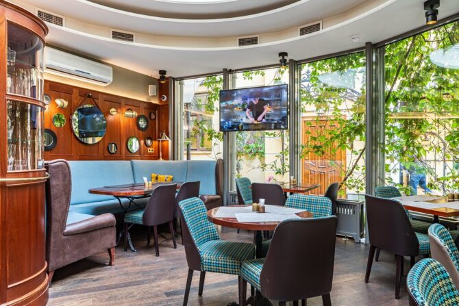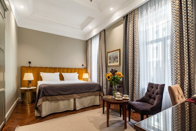 Классический, компакт, компакт двухместный – эти номера имеют рекордно маленькую площадь для гостиниц уровня 4 звезды: 15-21 м2. Оснащаются плазмой со смарт-приставкой, wi-fi, кондиционером, чайником, феном и утюгом. Мини-бар платный и включает в себя большой выбор припасов: шоколад, сок, минералка, снэки. Много алкоголя: водка, коньяк, шампанское, сухое вино и пиво. Вся продукция премиум-сегмента. Чайно-кофейный набор входит в стоимость, как и халат с тапочками. В санузле полноценная ванна с душем и косметическим набором. Также доступно меню подушек, по умолчанию же предоставляется гипоаллергенная подушка. Важное дополнение: есть номера с окнами на шумную улицу Марата и в тихий дворик. Рекомендуется учесть этот пункт при бронировании тем, у кого плохо со сном.