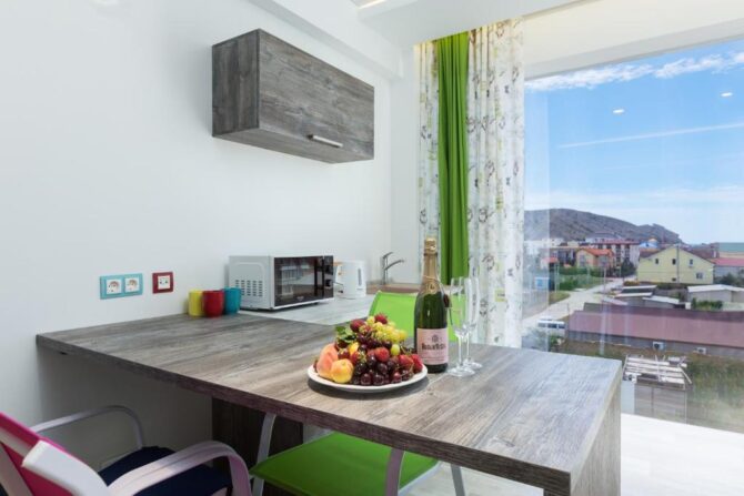 Светлана, Москва “Когда ехали в Судак и бронировали этот отель, то видели, что море довольно далеко, пройти где — то около километра, но сейчас хочется сказать не об этом. То время, которое проводишь в номере и на территории, тоже должно быть комфортным. Комнаты очень просторные и стильные, чудесные панорамные окна с видом на горы — это их “фишка”. Современная техника вся работает отлично, даже есть кухня, и можно готовить самим, при желании. В общем, кому нужна первая береговая линия, конечно, это не тот вариант, но по соотношению цена — качество — вариант супер. Персоналу отдельное спасибо!”