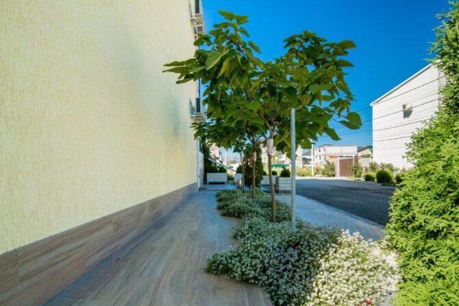 Двор гостевого дома небольшой, но весь утопает в зелени, находится под постоянной охраной, здесь очень безопасно. Для гостей с собственным транспортом предоставляются парковочные места.