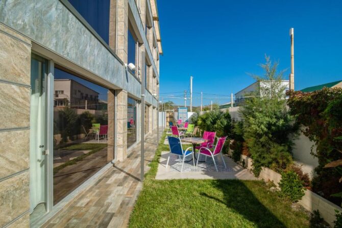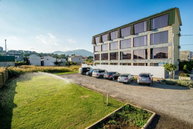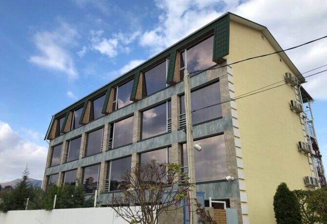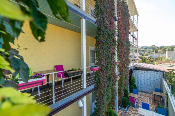 Гостевой дом — это современное здание, построенное в 2013 году, 4 этажа, к услугам гостей предлагают 18 номеров, отвечающих всем необходимым стандартам. Интерьеры выдержаны в классическом стиле с удобной мебелью, телевизором и кондиционером, во многих есть полноценная кухня. Особый шарм придают панорамные окна, которые ежедневно открывают гостям удивительные виды окрестностей. Кроме того, везде есть балконы, где можно посидеть вечером, не спускаясь во двор. Уборка ежедневная, на всей территории работает Wi-Fi.