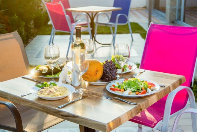 В стоимость проживания питание не включено, но в здании есть уютное кафе, где гости могут заказывать еду по меню, от завтраков до ужинов. Если вы привыкли и желаете питаться самостоятельно, то в номерах есть мини — кухня, которая вам такую возможность предоставит. Действительно, многие отдыхающие предпочитают только позавтракать в отеле, а потом весь день провести на пляже или экскурсии, в этом случае «свободный» стиль питания придется как нельзя кстати. В поселке есть рынок и магазины, где можно приобрести все необходимые продукты, и даже свежее мясо для приготовления его на гриле. В отеле можно арендовать мангал и все необходимое для самостоятельного пикника.