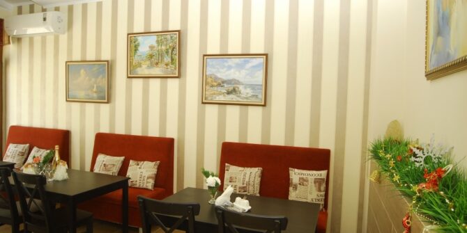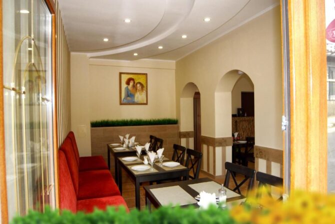 Отель предлагает два пакета питания. Один из них включает только завтрак, второй – полный пансион. Обеденная зона расположена в кафе на 1-м этаже. Оформление очень лаконичное, можно даже сказать скромное. Деревянные столы, стулья под гарнитур, мягкие диванчики. Так как кафе находится практически в центре Феодосии, то оно открыто для всех желающих перекусить или выпить кофе. Завтрак для постояльцев накрывается с 7 до 10 утра. Это традиционный континентальный завтрак, достаточно плотный даже для мужчин.