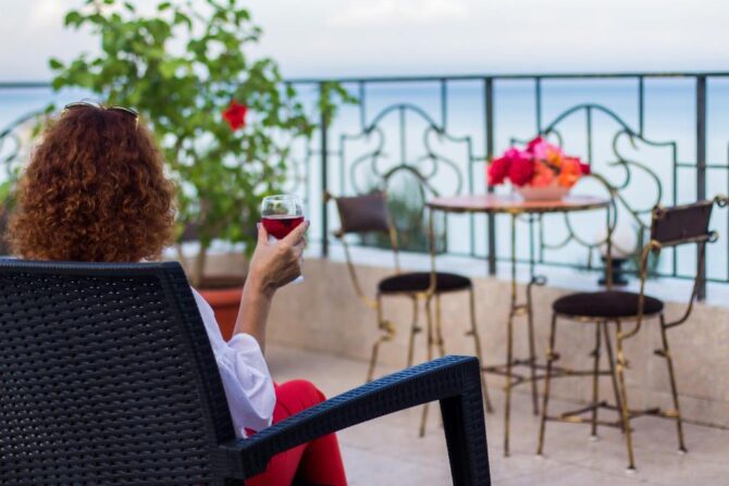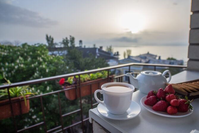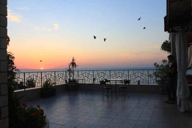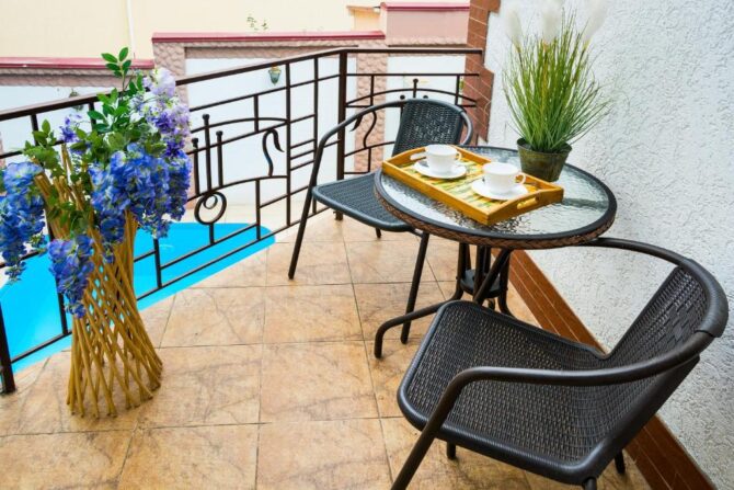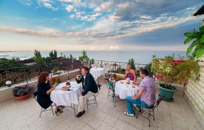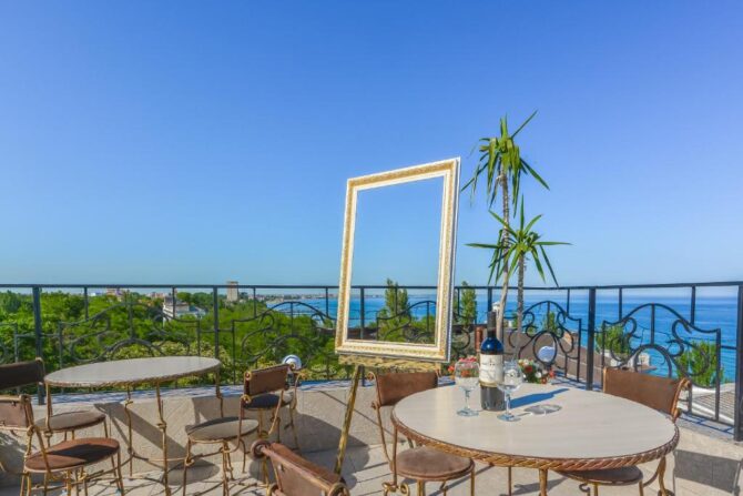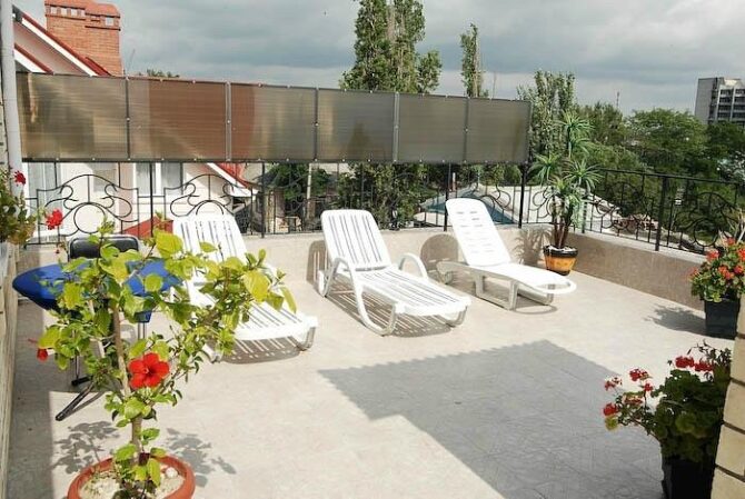 Изюминкой отеля является видовая терраса. Она приятно оформлена цветами, установлены столики, работает бар. Здесь можно вкусно поужинать, наслаждаясь панорамными видами Феодосии и ее окрестностей. Кстати, сюда можно приходить со своей едой или продуктами, которые можно приготовить на оборудованной мини-кухне.