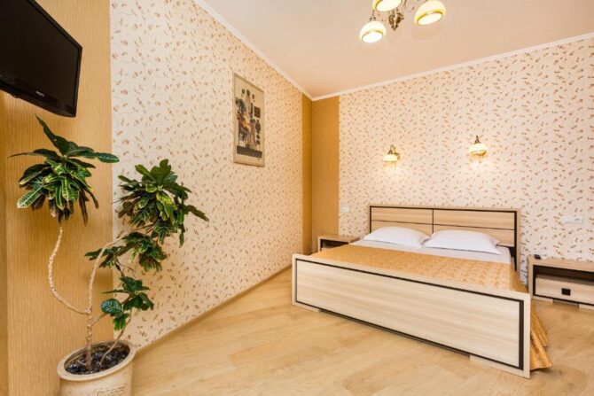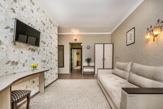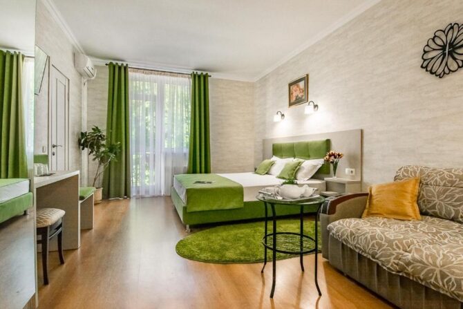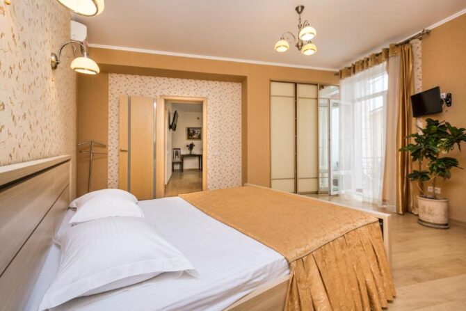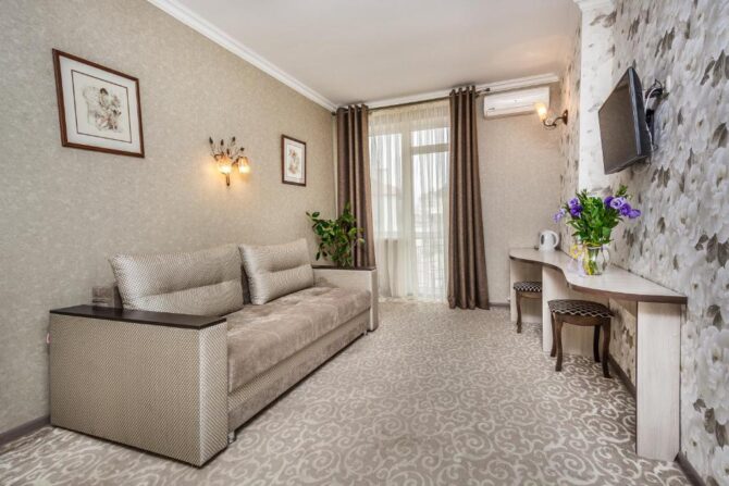 - Люкс (50 кв. м) – один двухкомнатный номер на 4-м этаже. В каждой комнате есть балкон. Частично видны море и внутренний дворик. В спальне установлена двуспальная кровать, в гостиной – диван и кресло. Номер рассчитан на проживание 3-х человек, но возможно размещение еще одного человека на кресле-кровати. В санузле оборудован душ.