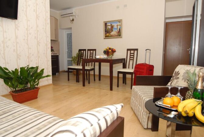 - Апартаменты (57 кв. м) с полностью оборудованной кухней. Номер находится на 2-м этаже, состоит из 2-х комнат с балконами. В просторной гостиной-студии есть диван и кресло-кровать в качестве дополнительного спального места. В спальне установлена двуспальная кровать. Санузел с ванной и душем-лейкой.