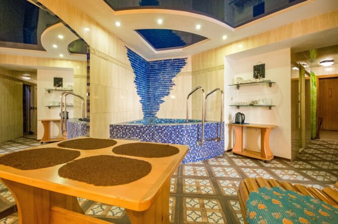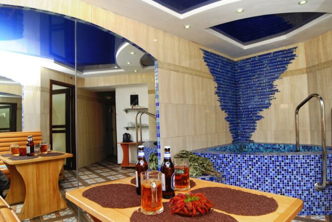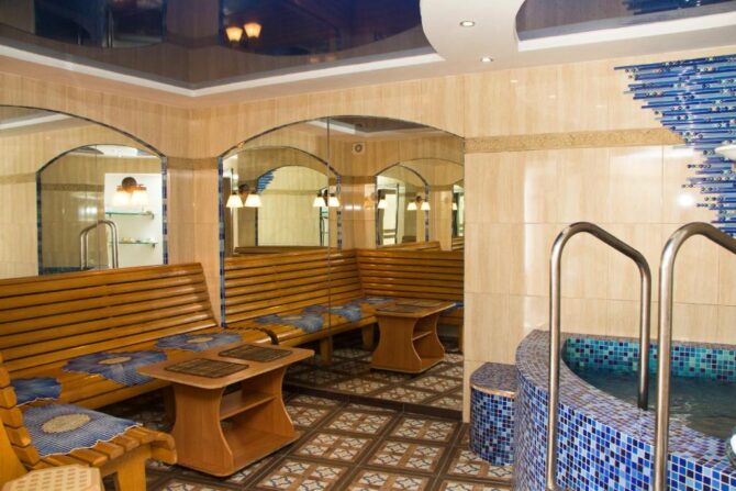 Отель предлагает насколько вариантов организации досуга. Кроме просмотра спутниковых каналов телевидения, можно заказать баню. Здесь построен небольшой комплекс, состоящий из русской и турецкой бань. Парные вмещают до 6 человек, услуга платная. Есть возможность заказать только одну из бань. Цена при этом будет ниже. В русской бане есть парилка на 6 человек, бассейн с чистейшей водой и подсветкой (не подогреваемый), деревянное ведро-водопад, две душевые кабины, санузел, комната отдыха с диваном.