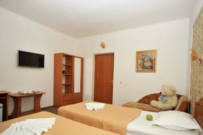 - Полулюкс (25 кв. м) предназначен для проживания 3-х человек. Номера находятся на 2, 3 и 4 этажах, с балконов открывается вид на море. В комнате установлена двуспальная кровать и раскладной диван. Есть электрочайник, посуда, столик для чаепития.