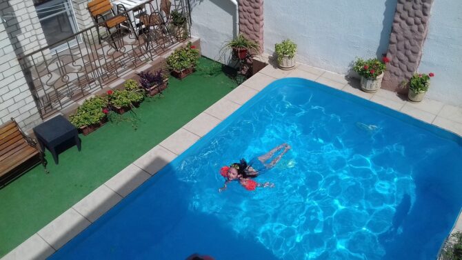 Во внутреннем дворе оборудован небольшой бассейн. Он и вправду совсем небольшой, и больше подойдет для купания детей. Мамам следует обратить внимание, что возле бассейна постелен ковер. На нем установлен столик со стульями, видимо, для вечернего отдыха взрослой пары. Персонал бывает недоволен, если дети после купания ходят мокрыми ногами по ковру. Это, конечно, мелочи, но лучше сразу вытирать ребенка после выхода из бассейна. Взрослым также стоит подготовить полотенца заранее.