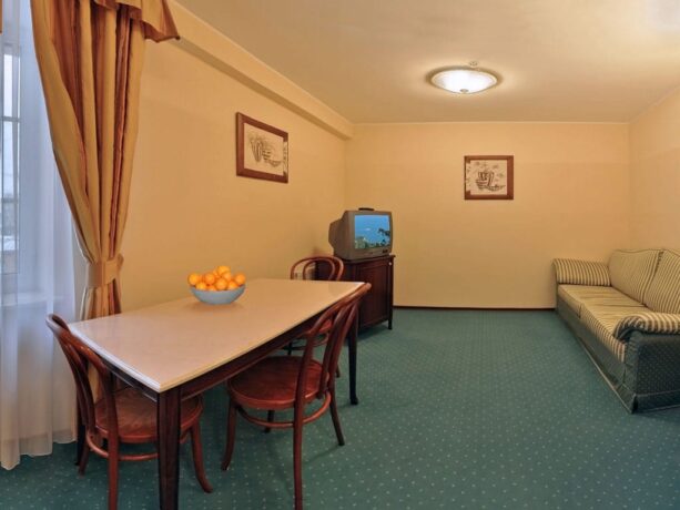 - Сюиты отличаются большой площадью, вместимостью и выполнением в современном или классическом стиле. В стоимость входит халат и тапочки. В «Элегант» есть санузел с джакузи и большая кровать 200х200. В «Премиум» вы найдете чайные принадлежности с письменным и дамским столиком.