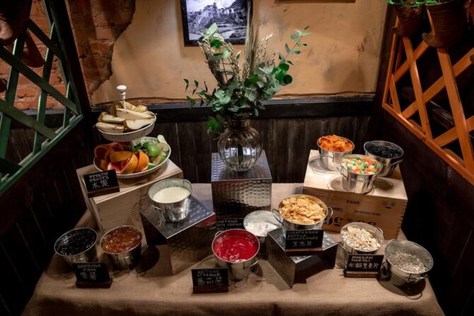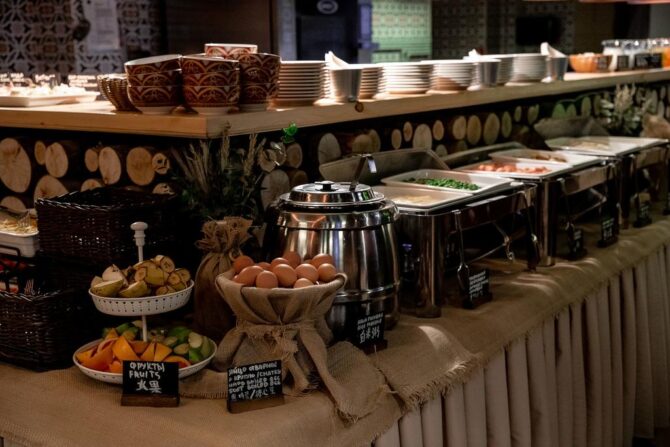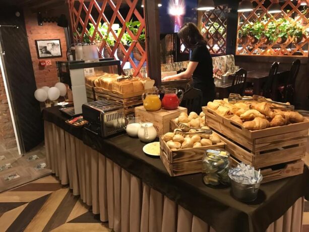 На первом этаже отеля расположился грузинский ресторанчик, где с 7 до 11 утра постояльцы заправляются едой из шведской линии. При входе гостя приветствуют: «Гамарджоба, дорогой» и предлагают угоститься «чем Бог послал». Горячее представлено несколькими блюдами и разными гарнирами. Рис, картошка, макароны. Много нарезанных овощей и зелени, которыми так богата грузинская кухня. Фрукты: порезанные бананы, киви, апельсины. Йогурт, соки, кофе. Есть и нарезочки: сыр и колбаса. Варёное яйцо, масло, хлеб. На десерт круассаны и другая выпечка. Можно наесться до отвала, но без изысков вроде красной икры с шампанским. Зато колоритный народный антураж заведения смотрится эстетично и свежо. Главная гордость – имитация старинного панно в виде фрески, выполненной под заказ.