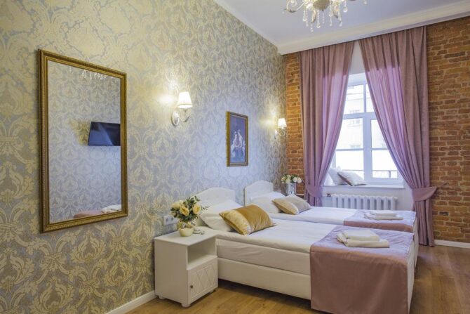 Здание отеля строилось для проживания духовенства и обслуги этого оплота католицизма, прокравшегося в патриархальную православную державу. Ныне мало что напоминает об этом, т.к. отель отреставрирован в духе европейских семейных гостиниц уровня 4 звезды. Дизайнерские интерьеры в аристократическом стиле – такова визитная карточка этого места. Зеркала в золочёных рамах, репродукции картин известных художников, хрустальные люстры, сохранённые исторические своды и кирпичная кладка – вместе создают камерную атмосферу небольшого отеля.