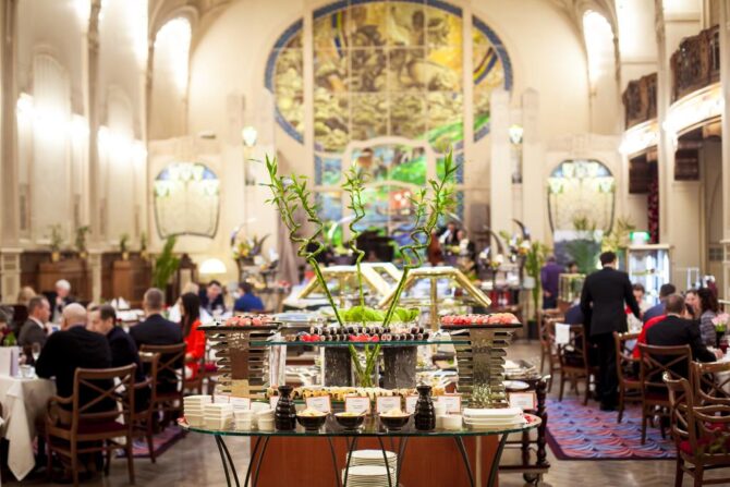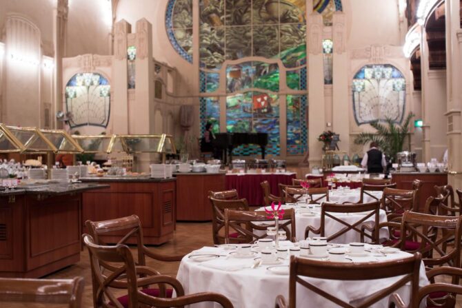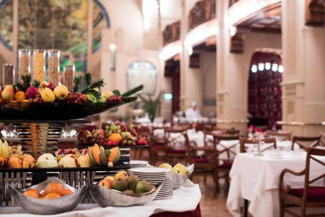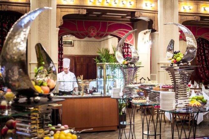 К услугам гостей – самые изысканные точки питания в городе. Основной ресторан «Европа», в котором накрывается завтрак, является лучшим в Санкт-Петербурге. «Шведский стол» накрывается утром и вечером. Завтрак входит в стоимость проживания, ужин можно купить отдельно. Утреннюю трапезу можно заказать в формате континентального, халяльного, азиатского, вегетарианского, безглютенового, английского завтрака. Ужин сервируется с понедельника по субботу. В воскресенье с 13.00 до 16.00 гостям предлагается бранч (объединение завтрака и ланча). В пятницу в обеденном зале проводятся вечера музыки Чайковского. Повара ресторана специализируются на блюдах французской кухни.