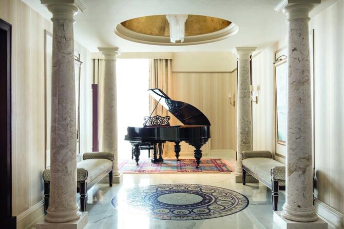 - Императорский люкс (350 кв. м) с великолепным видом на Невский проспект. К услугам гостей – две спальни, музыкальная гостиная с роялем, комната для игр, личная сауна, дворецкий.