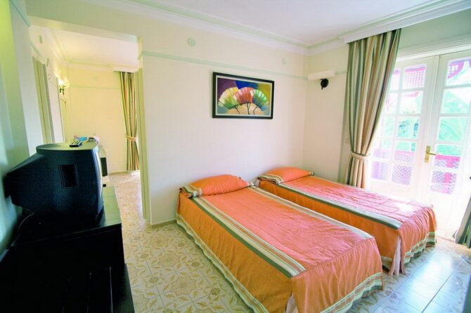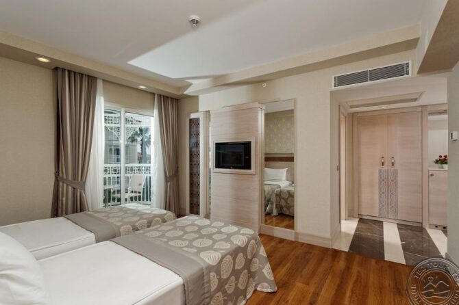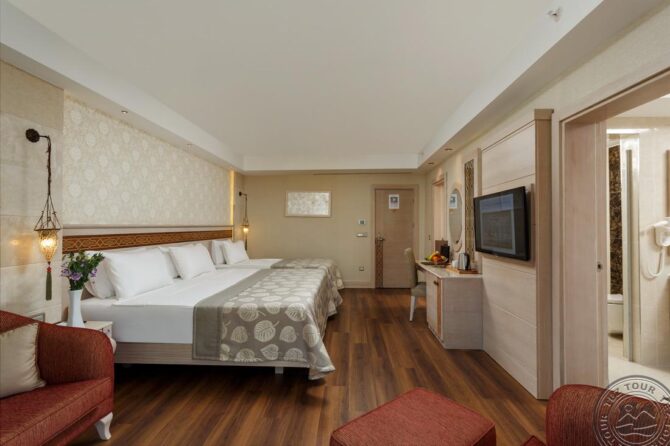 - Семейный состоит из двух отдельных спален, разделенных дверью, с одной ванной и тремя кроватями. Общая площадь – 80 м2. В обеих комнатах есть ЖК-телевизор и мини-бар.