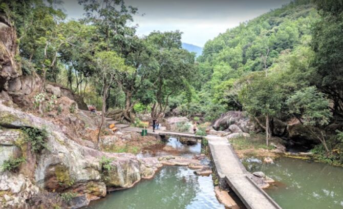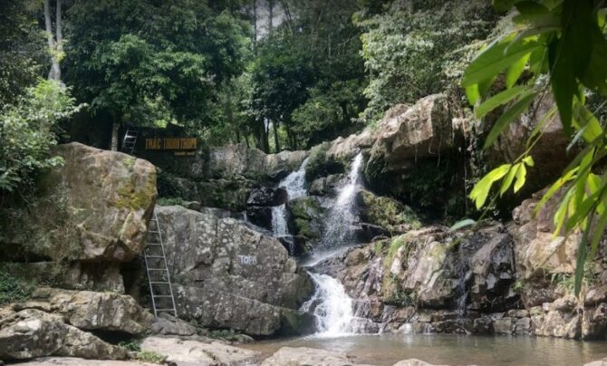 Один из самых красивых и высоких водопадов севера Вьетнама. В бассейне разрешено купаться, дно достаточно ровное и безопасное. На вершину ведет несколько лесных тропинок с каштанами, и в сезон из цветения аромат слышен повсюду. Предприимчивые вьетнамца собирают плоды, жарят и продают туристам, это очень вкусно.