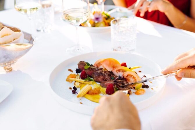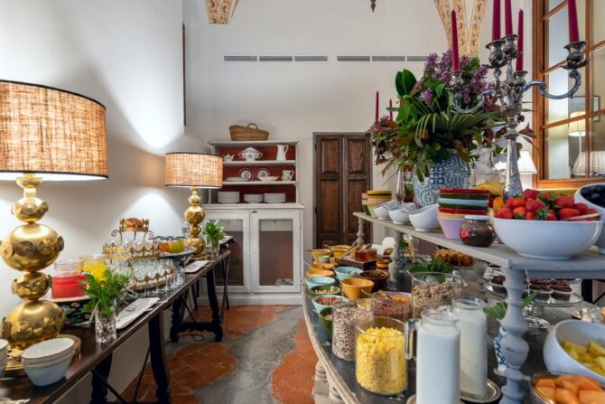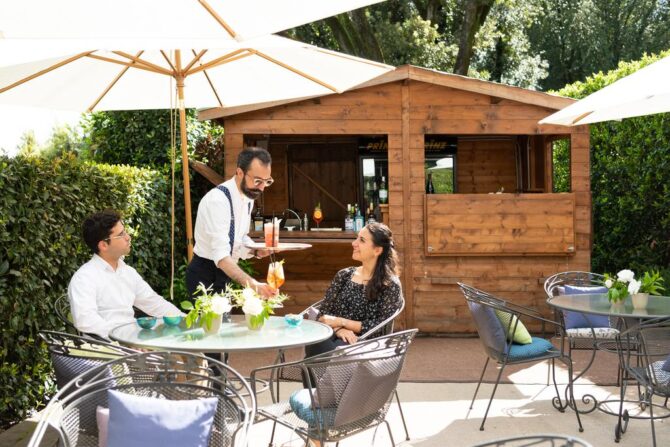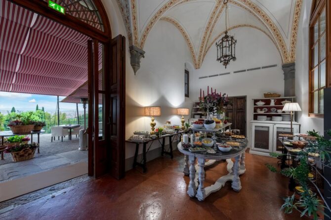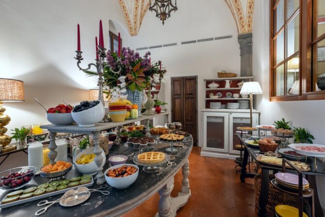 Завтрак гостям подают в номера, на балкон, террасу, в библиотеку или даже к бассейну, окруженному пышными зарослями цветущих растений, если утро для постояльцев начинается здесь. Помимо изысканного ресторана, предлагающего блюда традиционной тосканской кухни, в отеле работает кулинарная школа, где под руководством шеф-повара все желающие могут научиться готовить настоящие флорентийские деликатесы.