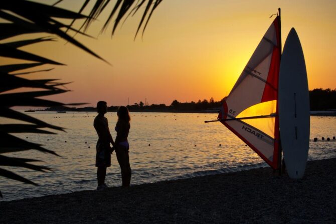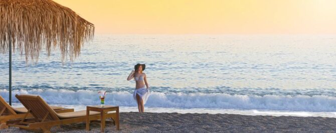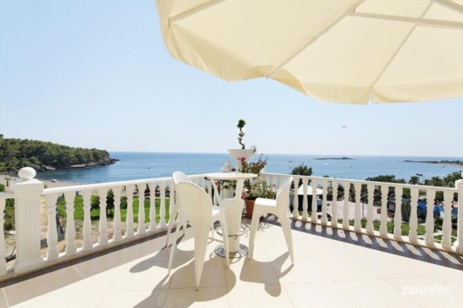 Собственный пляж Justiniano Deluxe Resort – это то, зачем сюда приезжает большинство туристов. Он имеет протяженность 100 м, ширина пляжа составляет 50 м. Он имеет песчано-галечное покрытие, есть зонтики, шезлонги, матрасы, выдаются полотенца – за все это платить не нужно.