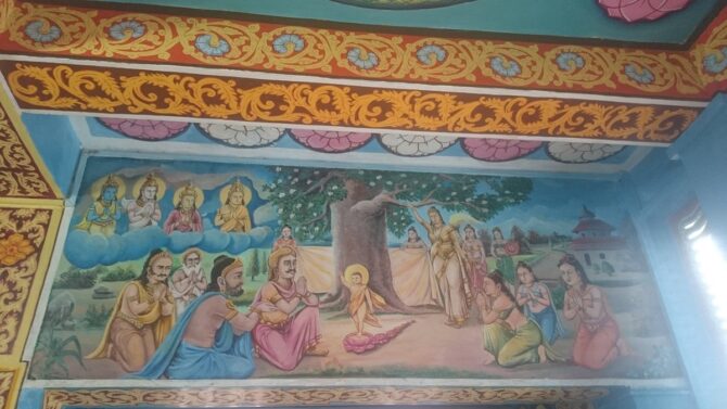Стены большой ступы Гангатилака Вихара внутри украшены фресками. Здесь их 74. Все они посвящены истории предыдущих реинкарнаций Будды. Из узких окон, расположенных под этими фресками, открывается прекрасный вид на реку Бентота и город.