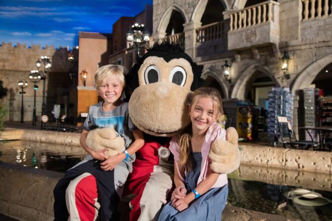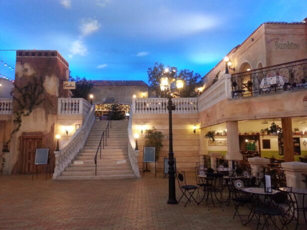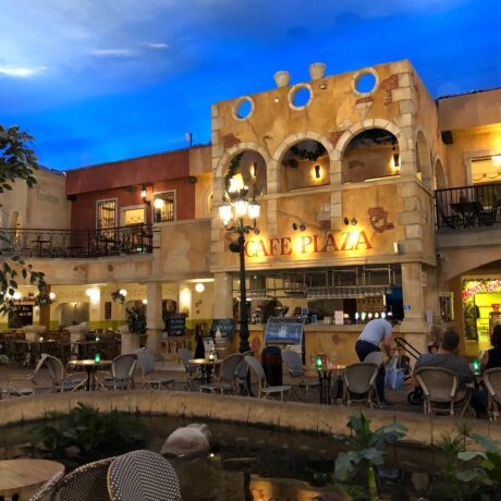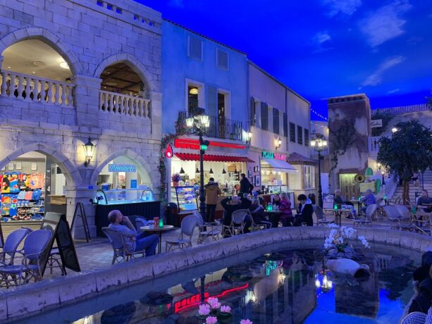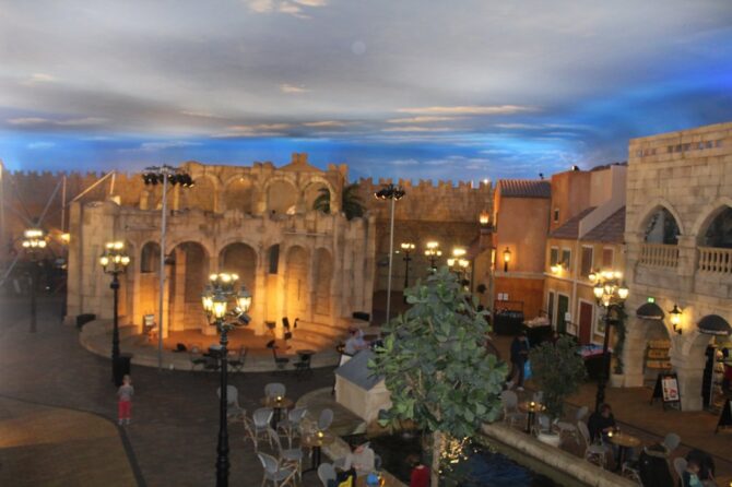 - Сразу от входа посетители окунаются в атмосферу южного городка. Повсюду пальмы и разноцветные фонарики. Дорога до бассейнов пестрит магазинчиками с игрушками, банными принадлежностями и аксессуарами для купания. Здесь расположены детские аттракционы, кафе и павильонами с мороженым. Дети могут попрыгать на батутах, поиграть в мини-гольф или боулинг.