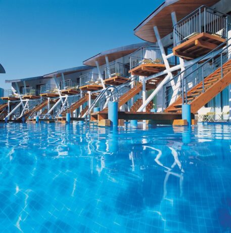 - открытые, крытые и детские бассейны с водными горками;