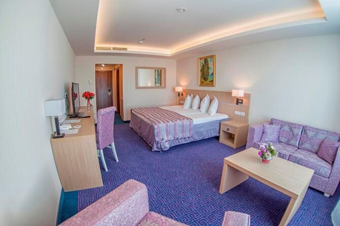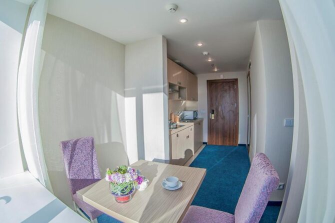 - Studio – одно помещение, разделенное на спальную и гостиную с помощью декоративной стены. Если выберете этот номер, вам доступен вечерний сервис.