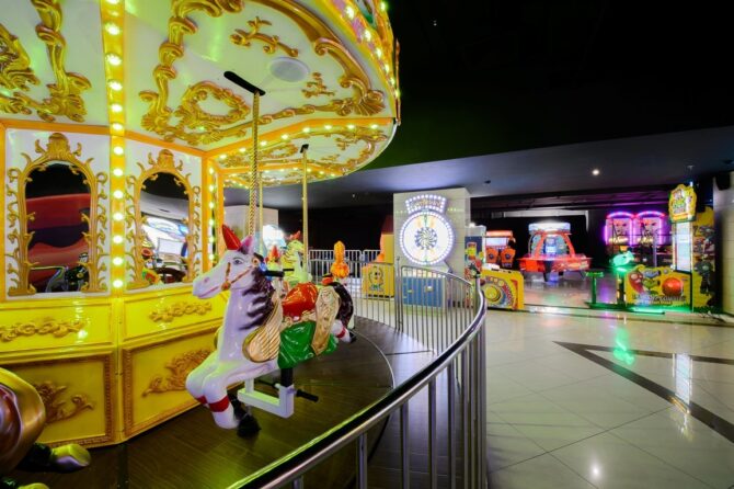 В детском развлекательном парке Корстон Серпухов есть более 50 игровых автоматов, видеосимуляторы, игровая комната лабиринт, аттракционы, карусели. Кроме этого аниматоры проводят интересные конкурсы с ценными призами. По территории комплекса ходит паровозик, который точно понравится вашему ребенку. Стоимость одного круг составляет 100 рублей.