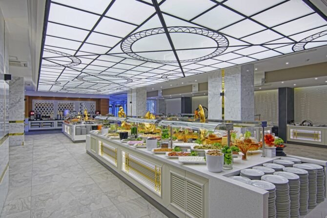 Питание предоставляется по системе UAI. Система «Ультра все включено» функционирует с 08.00 до 01.00, в нее входит алкоголь и безалкогольные напитки (местные), некоторые виды напитков, разнообразное мороженое в определенное время. Для удобства кормления детей предоставляются детские стульчики. За отдельную плату предлагаются свежевыжатые соки, импортные напитки, такие как абсолют, сафари, CHIVAS REGAL и др.
