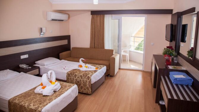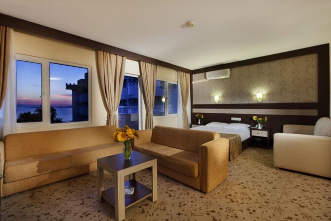 Этот гостиничный комплекс располагается в районе Инджекум. Маленький полуостров Фугла, который находится в 22 километрах от города Алания, отличается живописными пейзажами. Отель построен на первой береговой линии, поэтому вы сможете в полной мере насладиться великолепием Средиземного моря. В «комплектации» два четырехэтажного корпуса, один 5-и этажный и еще один трехэтажный.