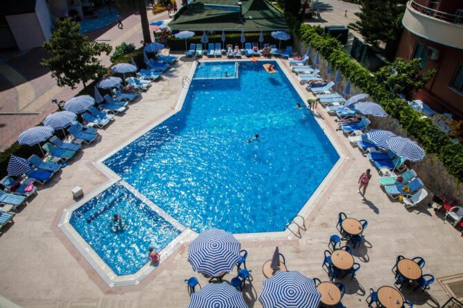 На территории гостиницы располагается четыре открытых бассейна, возле которых на протяжении всего дня работают профессиональные аниматоры. Кстати, все они хорошо владеют различными языками, поэтому вы не столкнетесь с трудностями перевода. Для детей построен отдельный бассейн с водными горками, на которых каждый желающий сможет в полной мере ощутить всю палитру острых ощущений.