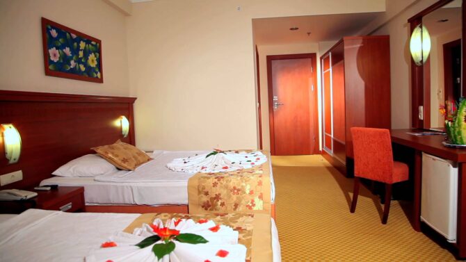Светлана, 33 года: «Нас встретила девушка Наталья, которая помогла заселиться и подарила нам гвоздики в честь праздника победы, это сразу сложило приятные первые впечатления о комплексе, поэтому в дальнейшем мы минусы старались не искать. Номер тихий и уютный, с видом на окрестности и горы. Если хочешь смотреть на море, можно доплатить 2 доллара в сутки и жить, при нас некоторые меняли, но с той стороны шум, поэтому мы остались в нашем. Хочется отметить неприятный запах полотенец, вроде чистые, но пахнут отвратительно. Бассейны прекрасные: большие и ухоженные, мы на пляж и не ходили, чтобы не сгореть на солнце».