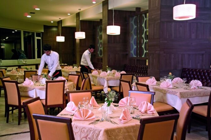 - На территории есть несколько шикарных ресторанов, в которых подаются блюда турецкой и европейской кухни.