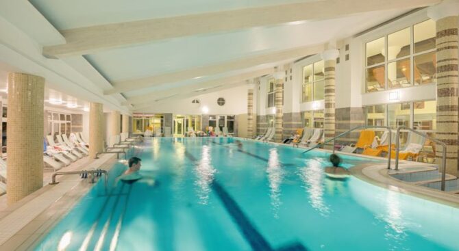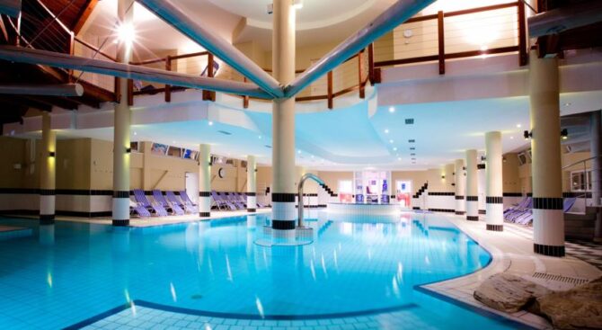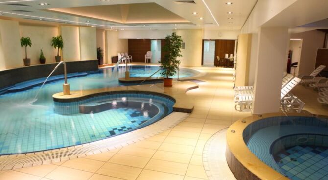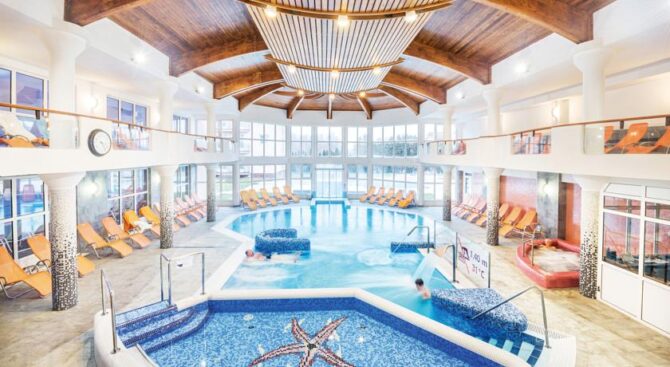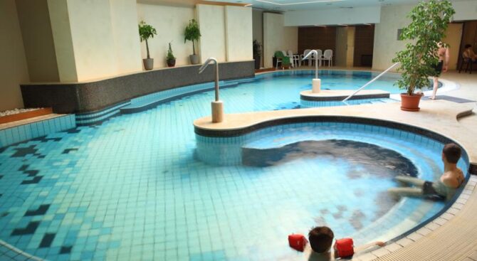 Отель специализируется на лечении опорно-двигательного аппарата, поэтому все бассейны наполнены целебной водой из озера. Отдельного внимания заслуживают открытый бассейн, занимающий площадь в 100 кв. м, бассейн с аттракционами, где можно насладиться гидромассажем, водопадом, подводной музыкой, световым шоу, и большой бассейн для любителей поплавать размером в 1120 кв. м.