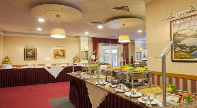 Завтрак и ужин в ресторане отеля представляют собой шведский стол с разнообразными блюдами, в том числе венгерскими. Если есть необходимость, можно заказать диетическое питание.