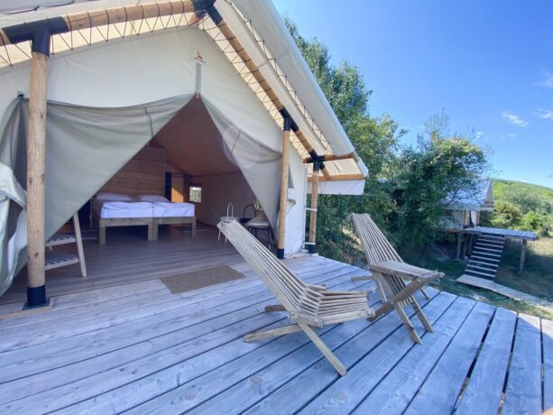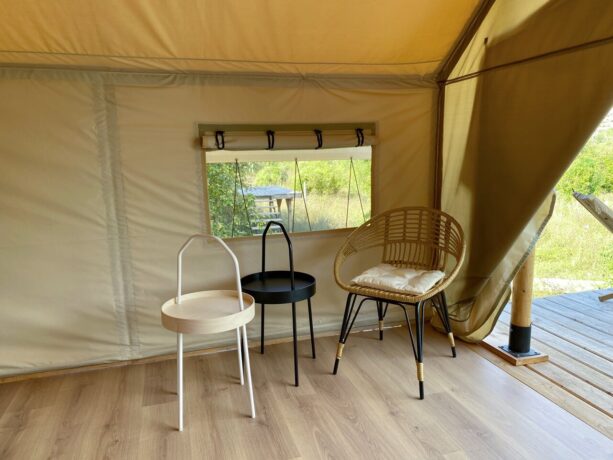 Размещение гостей предусмотрено в отдельно стоящих шатрах. Каждый из них укомплектован всем необходимым для комфортного времяпрепровождения, имеется вся мебель, санузел. Шатры располагаются на отдельных площадках и отдалены друг от друга на определенное расстояние, чтобы каждый смог насладиться уединенным отдыхом в окружении красивейшей природы. В жаркое время года прохладу в шатрах обеспечивают сплит-системы, а электропростыни согревают в прохладные крымские ночи.