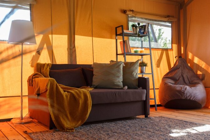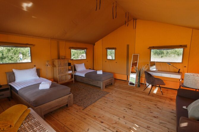 Для размещения туристов предусмотрены сафари-тенты. Удобства внутри продуманы настолько до мелочей, что придутся по душе даже семейным парам с детками. На территорию отеля проведено электричество и вода, работает Wi-Fi. Инфраструктура представлена кинотеатром под открытым небом, полем для гольфа, игровыми площадками.