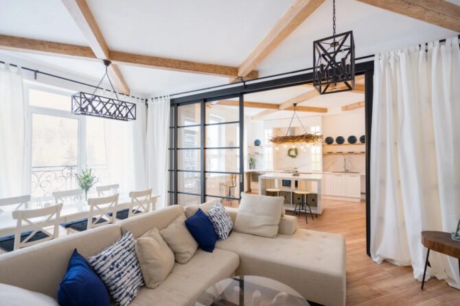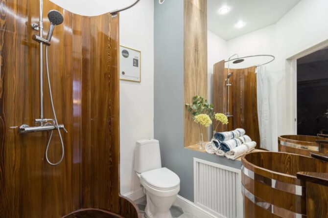 В отличии от предыдущих апартаментах, в этих, также находящихся в центре города, можно проживать с детьми. Более того, хозяева дают бонус в виде скидки на посещение Аквапарка «Ривьера», если гости останутся дольше 2-х дней. Квартира рассчитана на 6 человек. Приятной неожиданностью станет оборудованная в ванной комнате сауна. Комнаты просторные, с высокими потолками. Дом строился в сталинскую эпоху. Рядом находятся супермаркет «Августина», продуктовые магазины, пекарня. Прогуляться можно по городскому парку, парку развлечений Кырлай. Для любителей фаст-фуда работают точки по производству роллов и пиццерии.