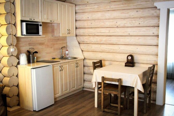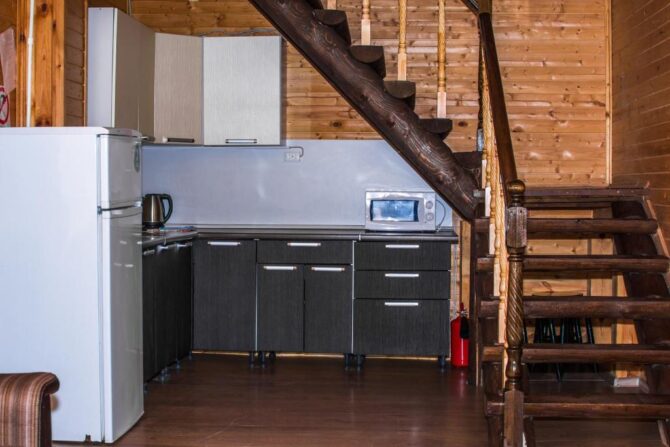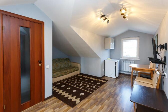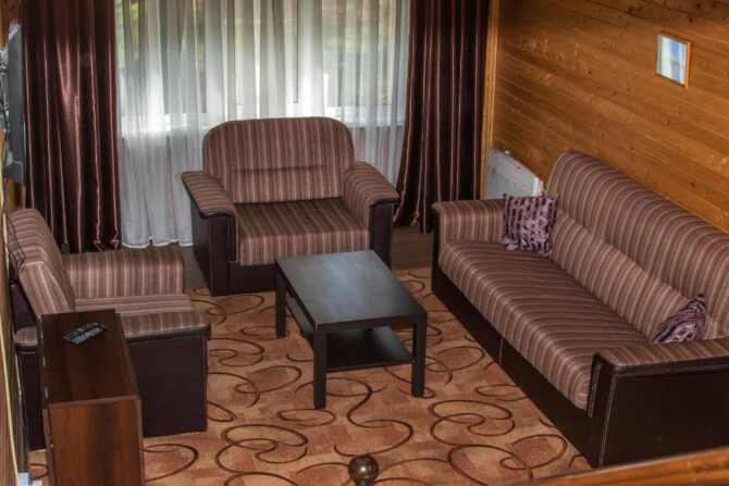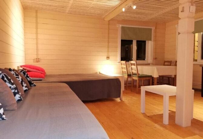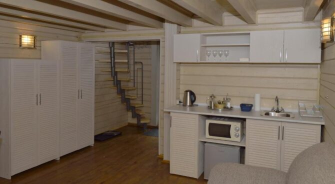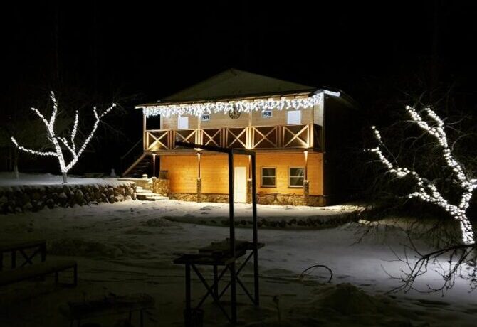 Туристы могут выбрать один из 12 уютных номеров гостевого дома или арендовать отдельный коттедж. Стоимость суточного проживания для одного человека – от 2 до 8 тыс. р. Здесь и далее по тексту указываются цены, действительные в 2021 г. и первой половине 2022 г. Для организации питания и досуга отдыхающие могут пользоваться несколькими помещениями, расположенными на первом этаже гостевого дома и на территории базы отдыха: