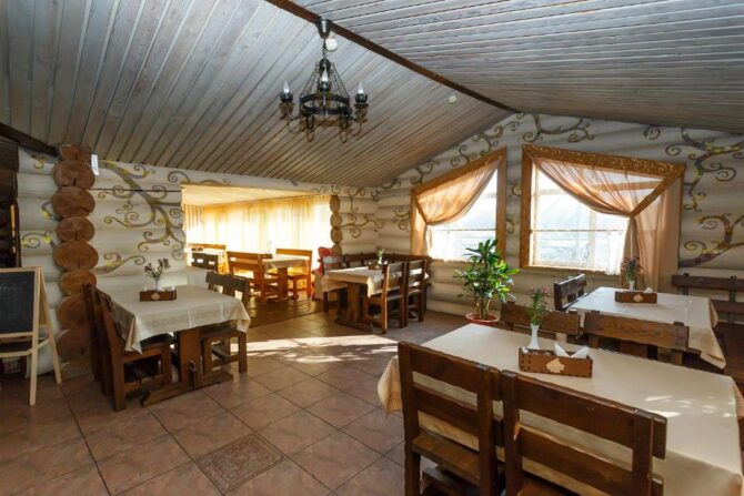 Уютный зал кафе базы отдыха рассчитан на 60 человек. Меню включает простые, но вкусные русские блюда. Гости могут арендовать кафе для новогоднего ужина. Стоимость услуги – 2 тыс. р. Из зимних развлечений здесь доступны несколько занятий: