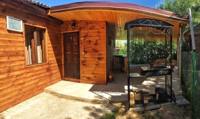 - Одноэтажный дом на 6 человек: терраса, гостиная-кухня, две спальни, ванная комната.